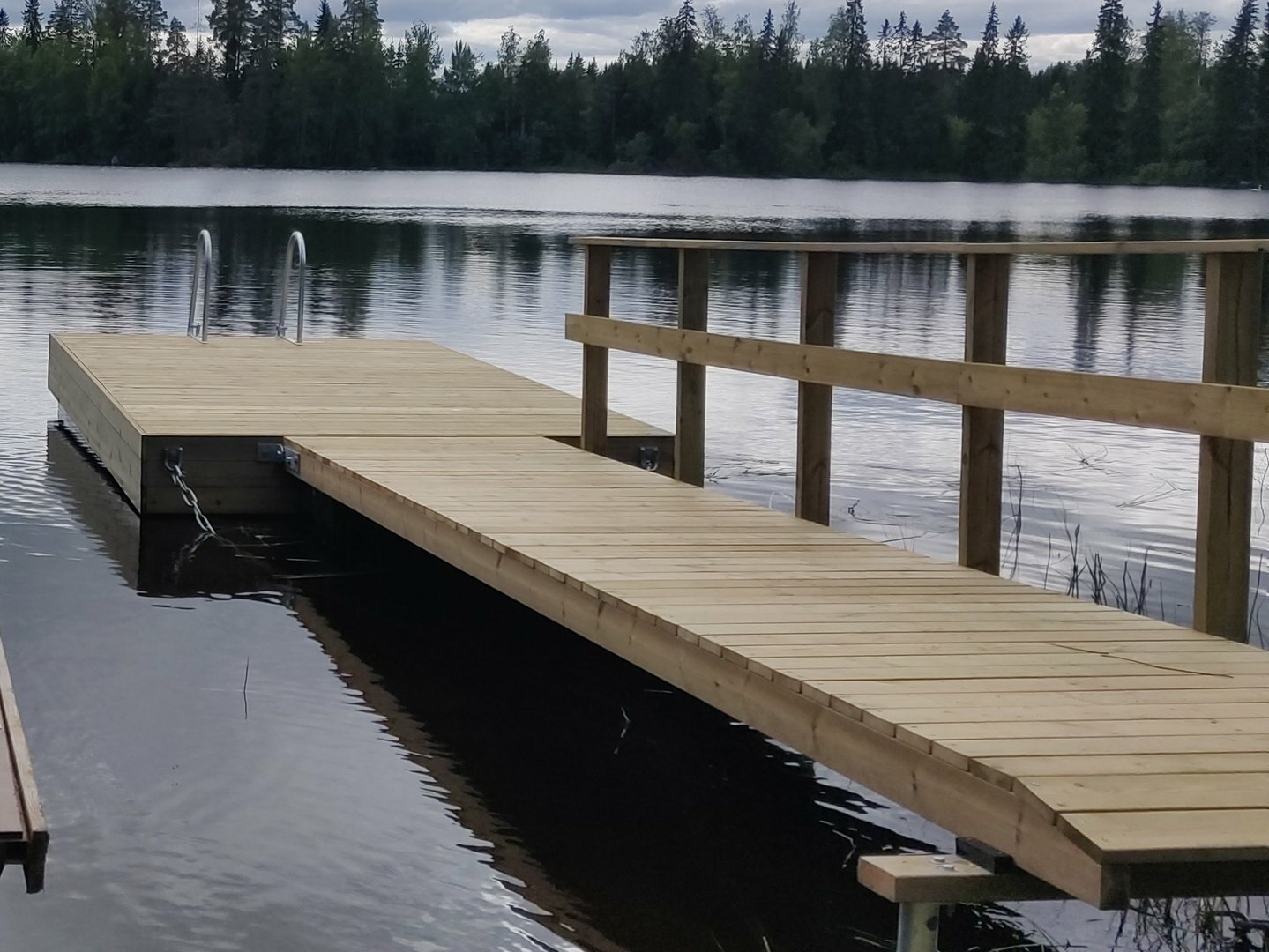 Kotimainen Finlandia Marinen valmistama Kaislatar PP4 - putkiponttoonilaituri. Koko: laituriosa 2,4 x 4 metriä ja käyntisilta 1,2 x 4 metriä, laiturin kokonaispituus 8 metriä. Ponttooneita laiturissa 2 kpl jotka on valmistettu vahvasta PE-HD muovista, koko Ø400mm x 4000mm, käyntisillassa lisäponttoonina 220L Meltex maxi muoviponttooni. Laiturin runko 48 x 148mm ja kansi 28 x 120mm, puun materiaali kotimainen painekyllästetty mänty. Kansilautojen kiinnitykset ruostumattomilla ruuveilla. Ponttoonien kantavuus n.1200kg, kansikorkeus n.35 cm.